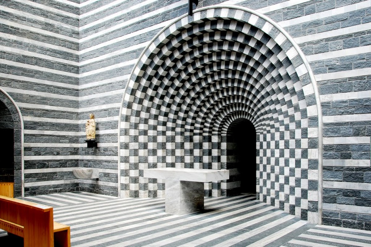 Au printemps 1986, une avalanche emportait une partie du village de Mogno au Tessin. Douze maisons en tout, sans oublier la petite église dédiée à Saint-Jean-Baptiste balayée par les éléments. Le hameau décida de reconstruire le chapelle disparue. En 1990, c'est Mario Botta qui s'y colle. Il imagine un cône tronqué, éclairé uniquement par une gigantesque lucarne zénithale, et dont l'alternance de marbre de Peccia et de granit du Val Maggia, rythme ce lipstick en noir et blanc. Un battement coloré qui continue à l'intérieur - mais en motif damier - de ce mini espace qui peut contenir 15 personnes à tout casser. Total Op'Art.