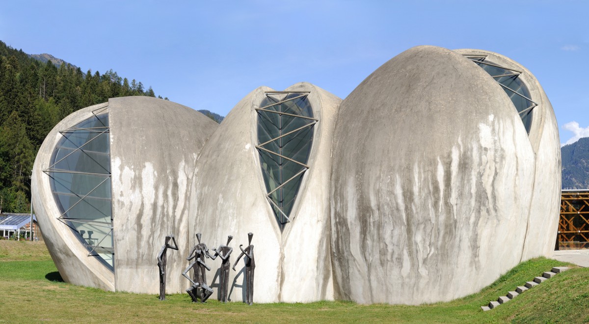 A Cazis, tout petit village des Grisons, la paroisse ressemble à une baraque Barbapapa. Un édifice-bulbe à trois ventricules percés de larges fentes pour laisser entrer un maximum de lumière et dont l'analogie avec les pierres de la rivière toute proche lui ont donné son nom: Steinkirche. Construite en 1994 sur les plans de l'architecte grison Werner Schmidt, l'église s'est adjoint l'expertise de Heinz Isler, le spécialiste du voile de béton. L'auteur du pavillon Sicli à Genève, a ainsi du résoudre l'épineux problème des ouvertures, les immenses fenêtres en amande complexifiant la statique d'un bâtiment conçu comme un oeuf.