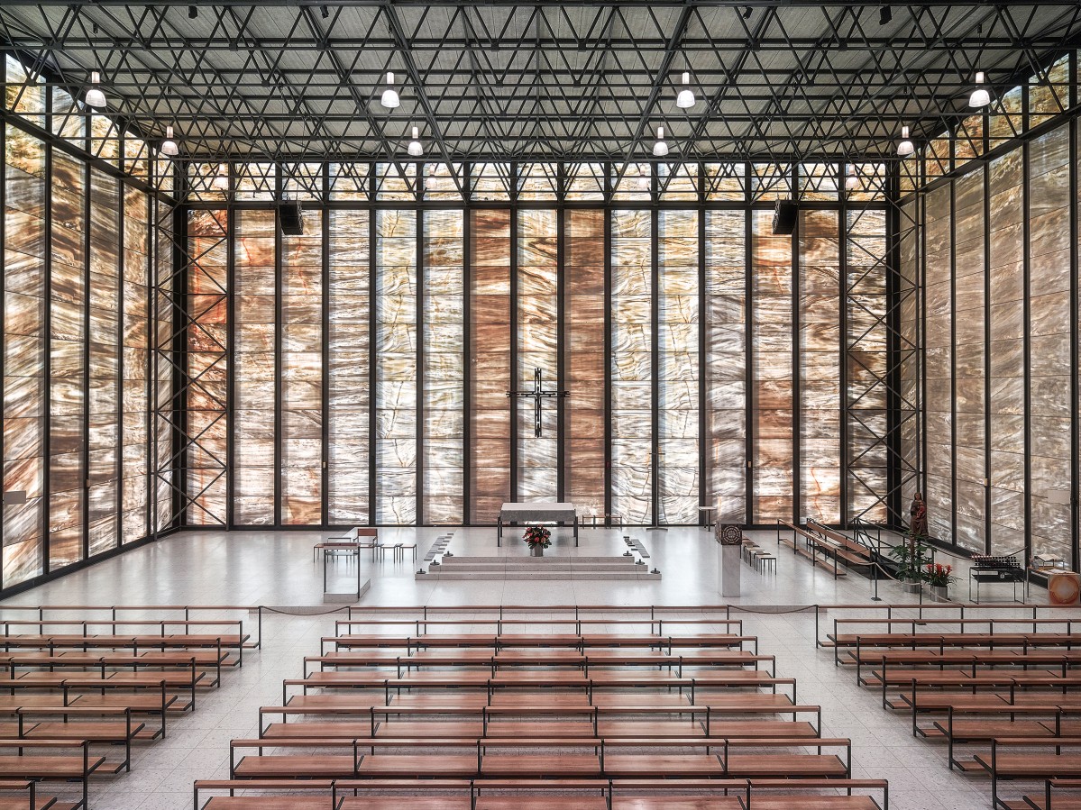 Vu de l'extérieur, l'église Saint-Pie c'est un cube blanc, un monolithe enchâssé dans un carcan d'acier posé à deux pas de Lucerne, pas très loin du lac des Quatre-Cantons. Vu de l'intérieur, c'est l'expérience d'architecture sacrée la plus hallucinante du pays. Les plaques de marbre translucide qui recouvrent intégralement l'édifice prennent soudain feu lorsque la lumière passe au travers. Le dessin aléatoire de la pierre révèle alors en couleur fauve un espace complètement vide rendu possible par l'utilisation d'une structure métallique, à la manière d'un hangar, dessinée en 1966 par l'architecte Franz Füeg.