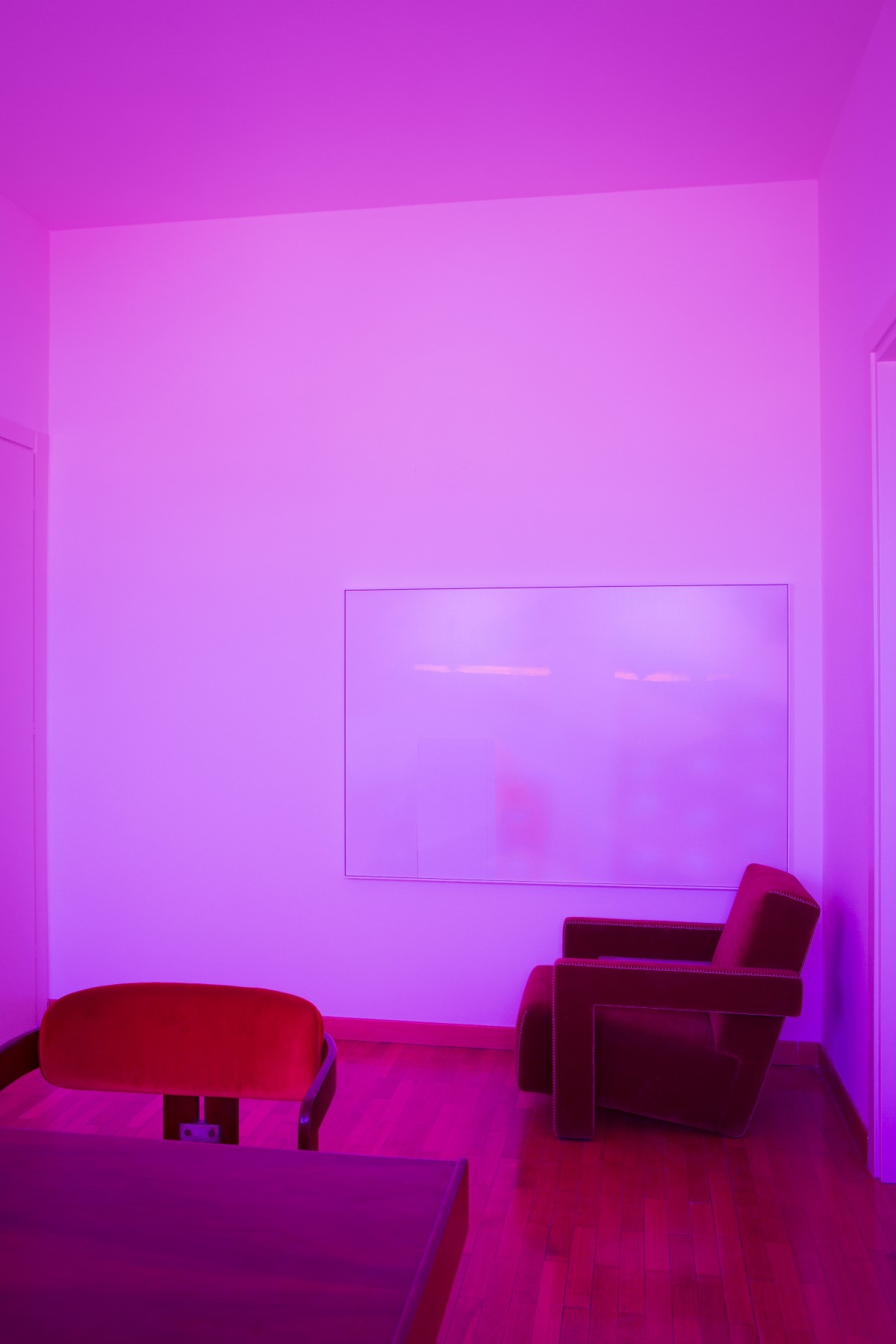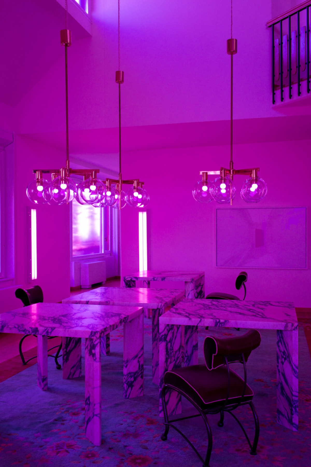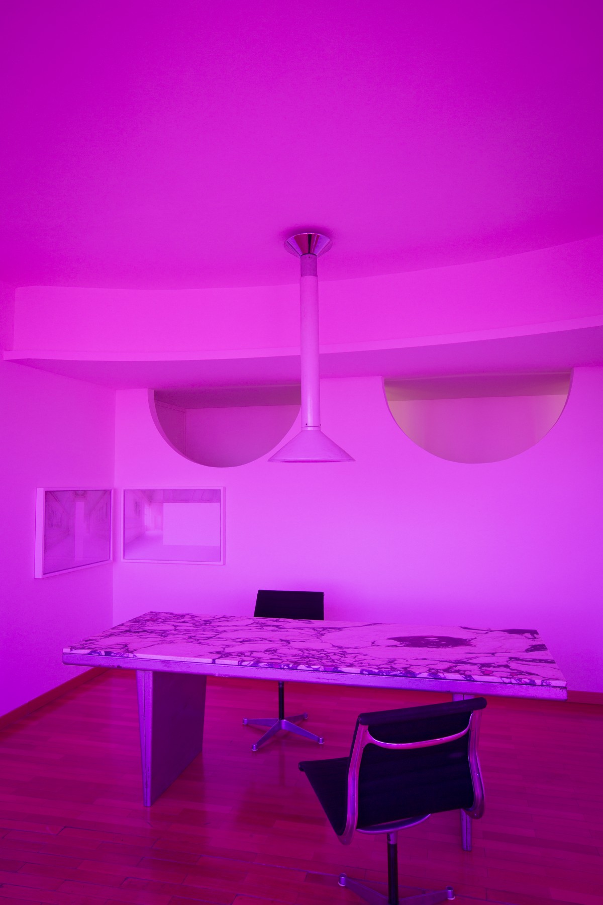 C’est ainsi que tout l’attique vibre d’une aura fuchsia dans laquelle la table Velasca, aux pieds anguleux, règne en pièce maîtresse. Taillée dans un marbre Calacatta, provenant d’une carrière véronaise, elle est un « hommage à cette tour au style néo-Liberty italien, plutôt rationaliste. J’ai travaillé, pour aménager l’espace, sur le thème de la lumière. J’ai ainsi appliqué des pellicules colorées aussi bien sur les vitres que sur les lampes dans l’intention de créer une ambiance romantique futuriste, prête à accueillir mon mobilier.»