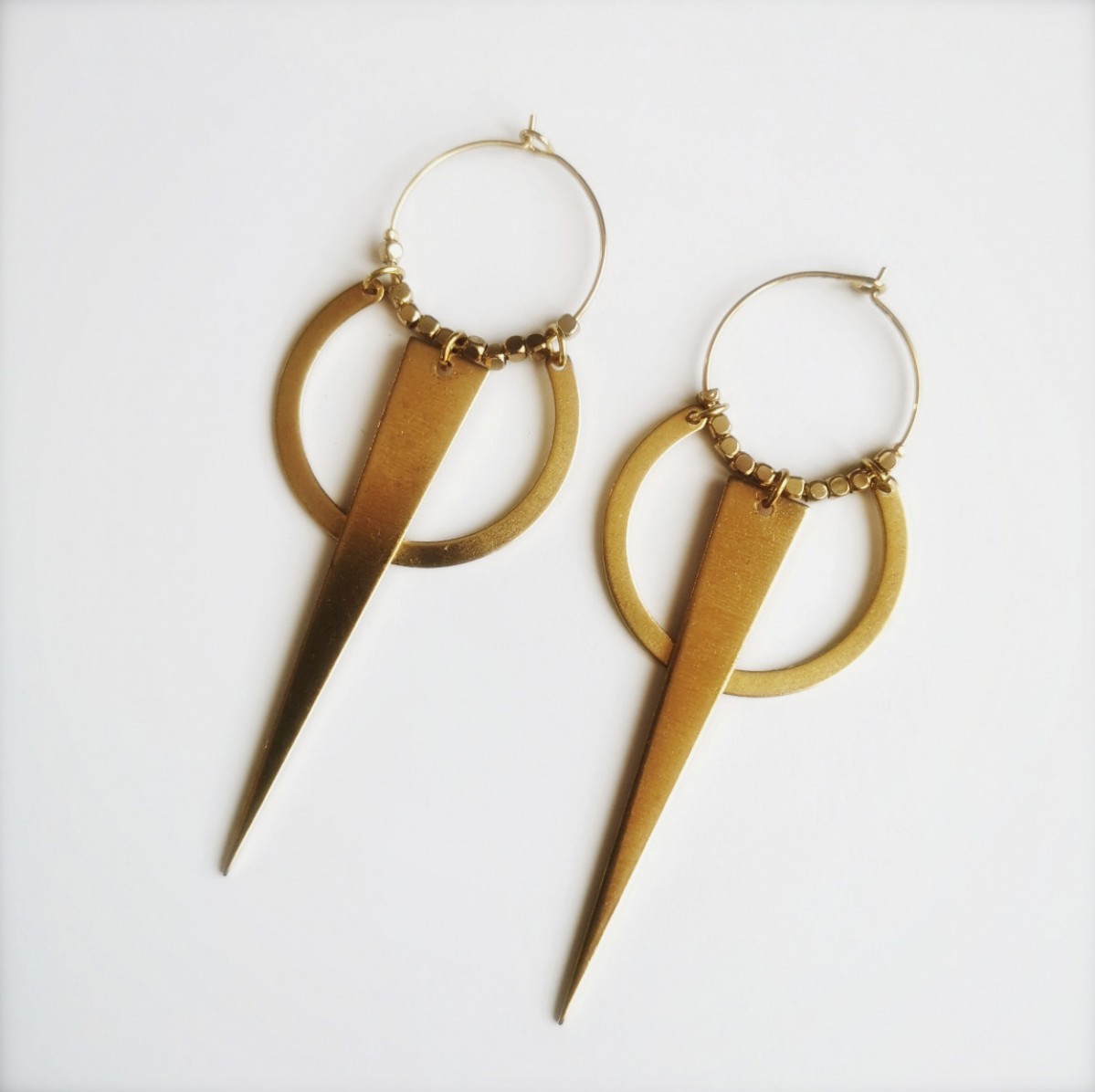De son imagination naissent des boucles d’oreilles en laiton, «un matériau que j’adore», dit-elle, agrémentées de résine ou de pierres semi-précieuses telles la labradorite, l’amazonite, le quartz, l’opale ou la howlite, un borosilicate de calcium de couleur blanche.