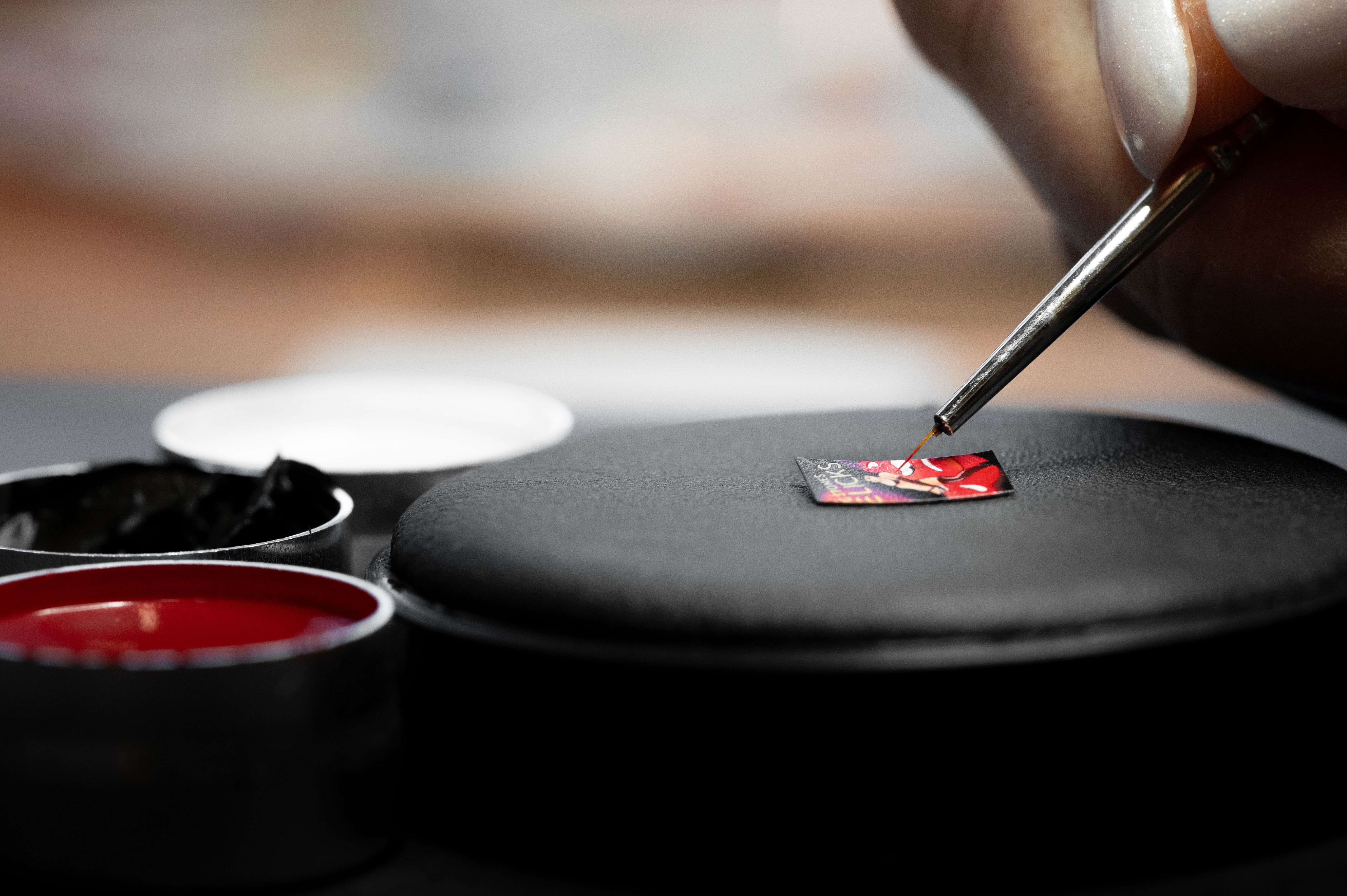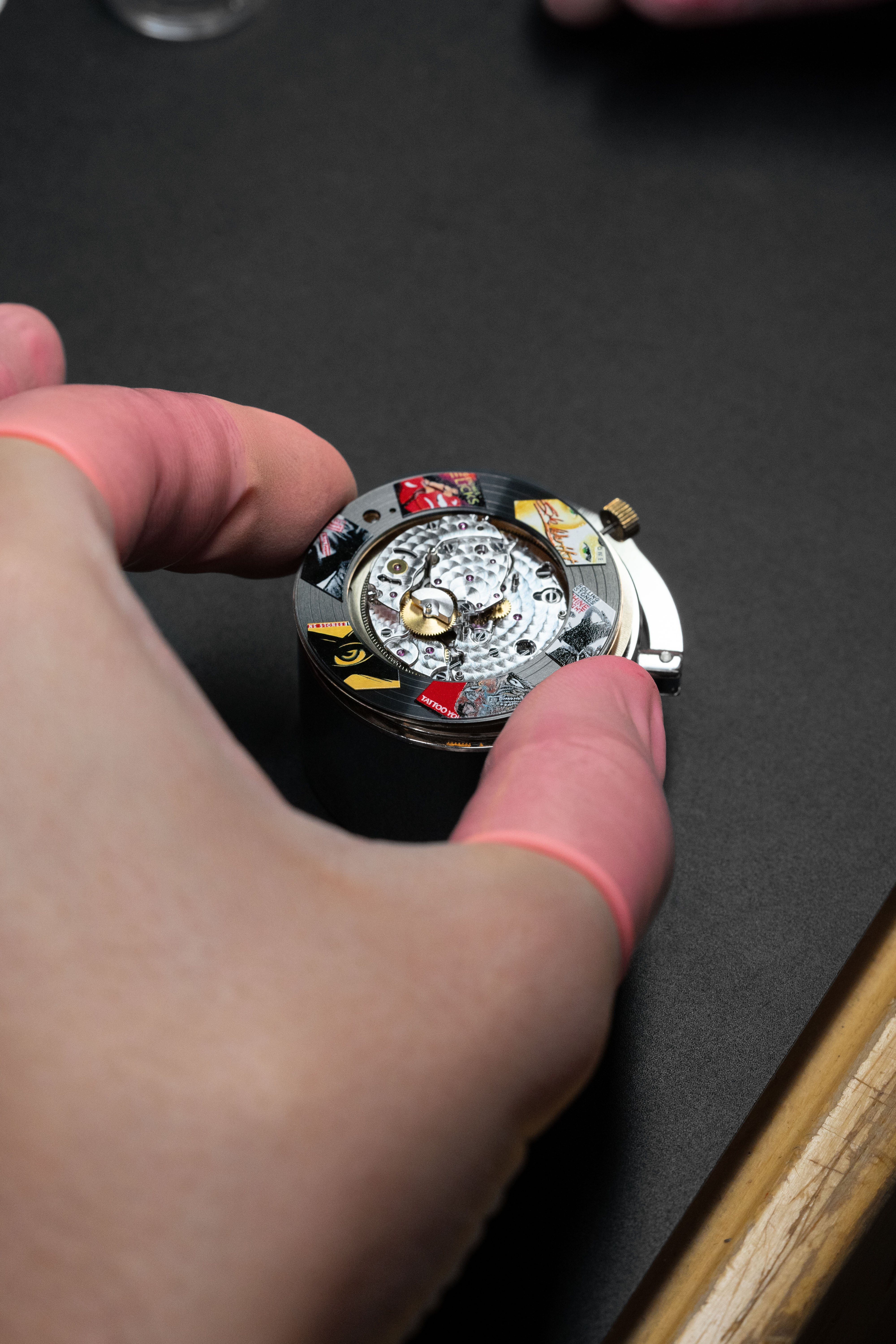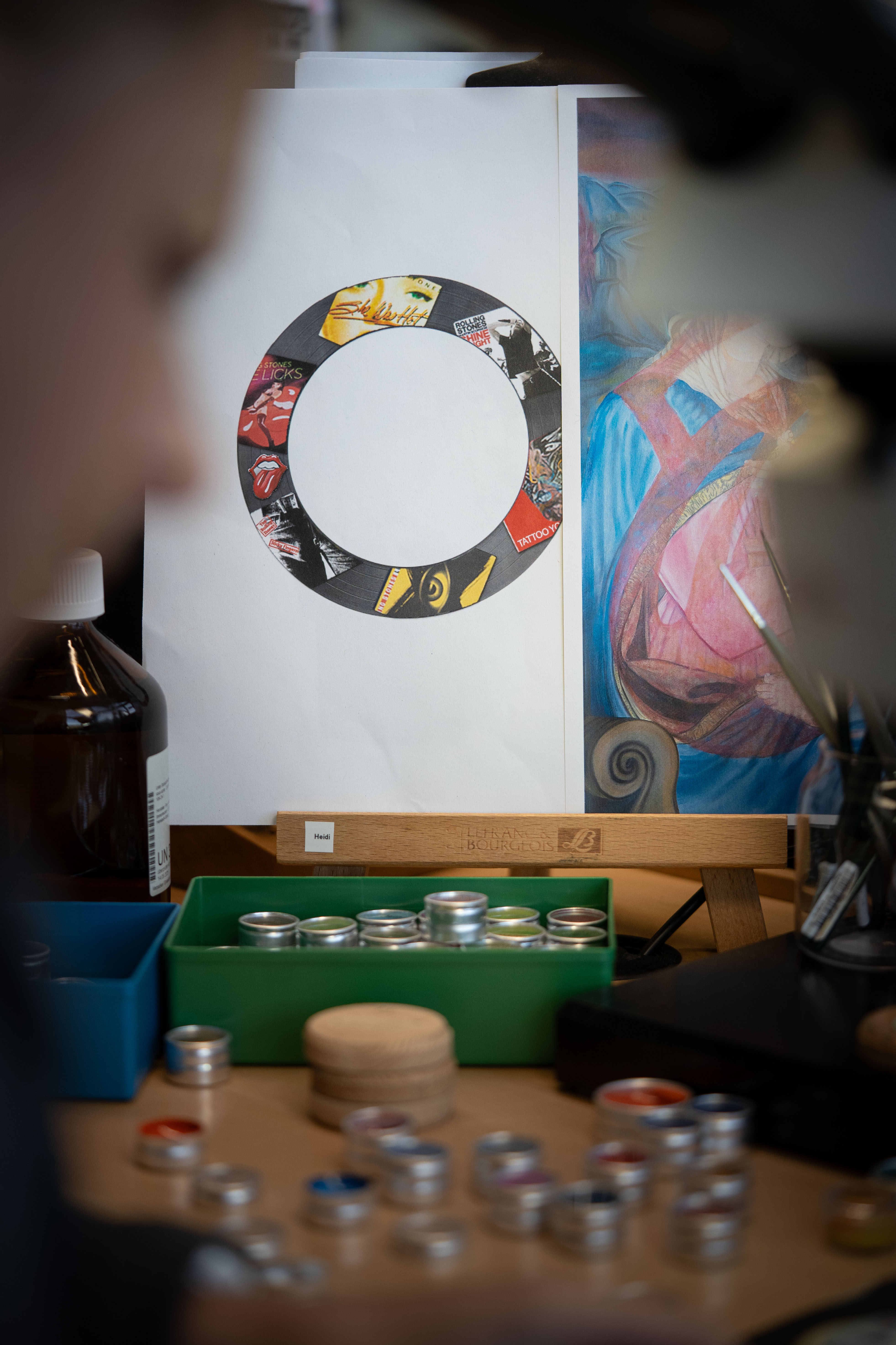 C’est dans cette atmosphère d’élégance rare que Lara Marino est entrée, porteuse d’une vision singulière. Après une exposition chez Quartier Général, un centre d’art contemporain de La Chaux-de-Fonds, elle est appelée par Jaquet Droz pour une collaboration inédite. L’horlogerie, l’art et la musique des Rolling Stones allaient fusionner, donnant naissance à des pièces uniques, imprégnées de symbolisme et de passion. «La manufacture m’a invitée à m’immerger dans son monde, un univers où chaque détail compte, où chaque cadran est une miniature d’exception. J’y ai rencontré Heidi, une artiste autodidacte dévouée qui, jour après jour, couche sur la porcelaine fine des motifs d’une précision exquise.» Elle travaille la peinture au pinceau sur des cadrans d’une taille à peine visible. Les yeux rivés dans son binoculaire, elle révèle le microcosme d’un univers artistique dans l’infime espace d’une montre, chaque trait de pinceau étant un acte de foi dans l’artisanat.