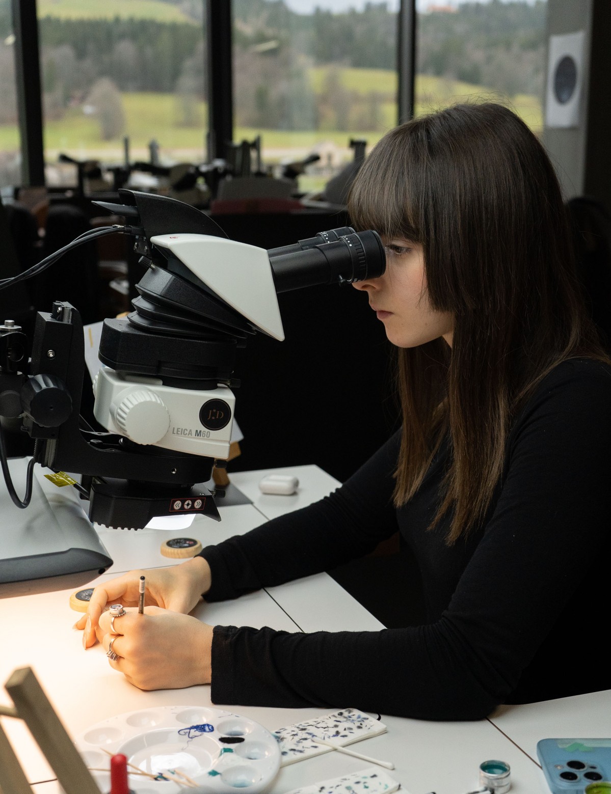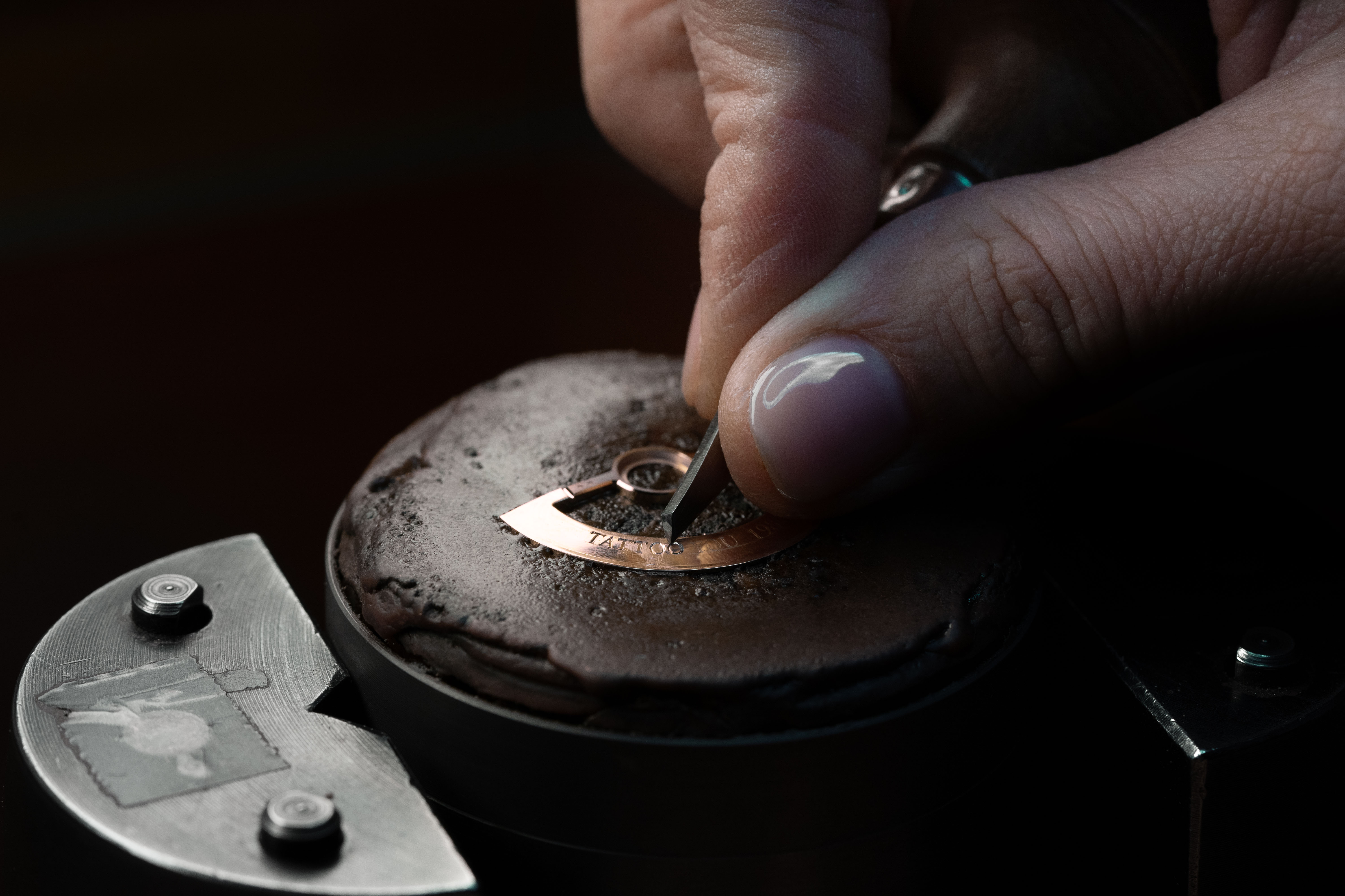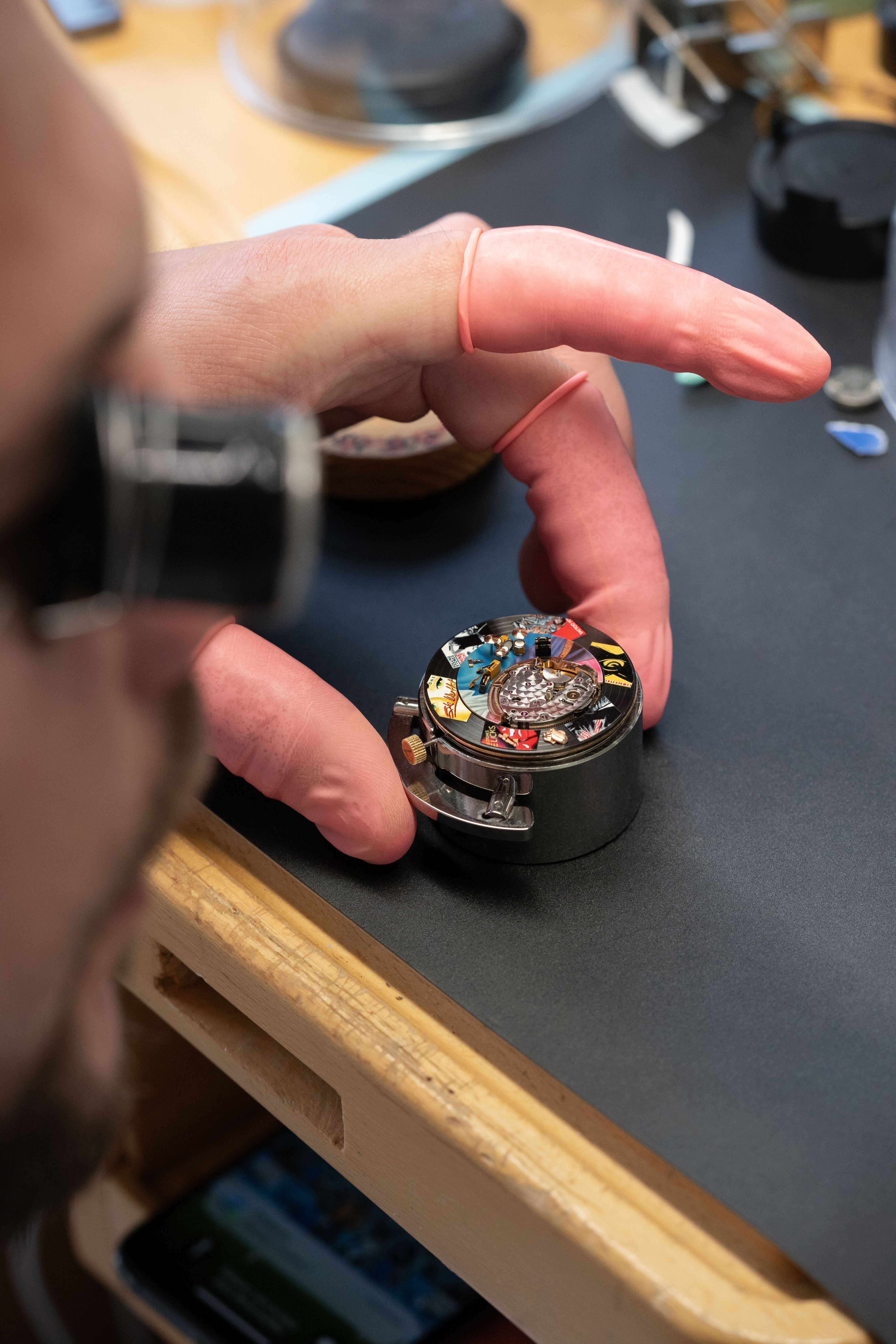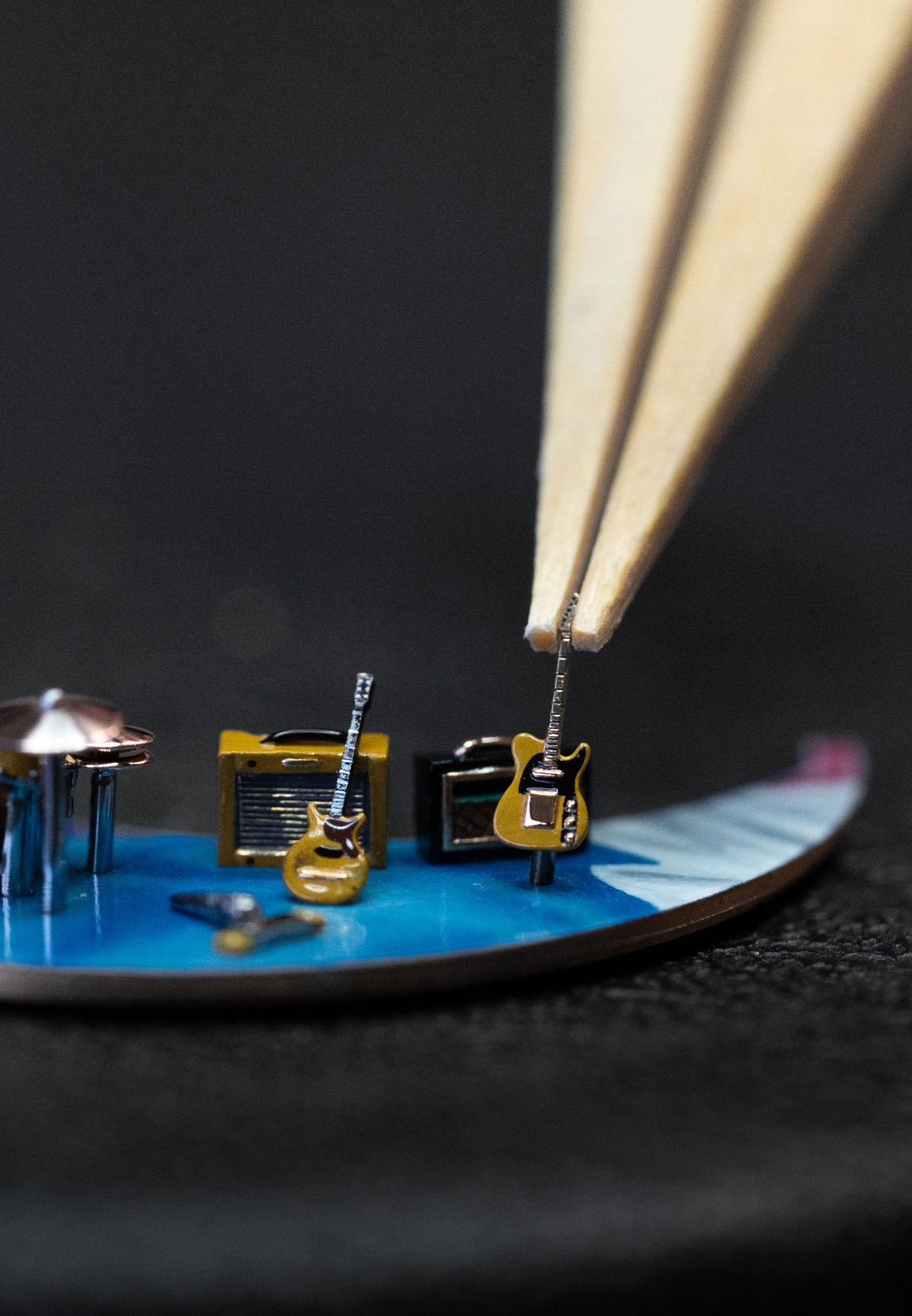 C’est dans cette atmosphère d’élégance rare que Lara Marino est entrée, porteuse d’une vision singulière. Après une exposition chez Quartier Général, un centre d’art contemporain de La Chaux-de-Fonds, elle est appelée par Jaquet Droz pour une collaboration inédite. L’horlogerie, l’art et la musique des Rolling Stones allaient fusionner, donnant naissance à des pièces uniques, imprégnées de symbolisme et de passion. «La manufacture m’a invitée à m’immerger dans son monde, un univers où chaque détail compte, où chaque cadran est une miniature d’exception. J’y ai rencontré Heidi, une artiste autodidacte dévouée qui, jour après jour, couche sur la porcelaine fine des motifs d’une précision exquise.» Elle travaille la peinture au pinceau sur des cadrans d’une taille à peine visible. Les yeux rivés dans son binoculaire, elle révèle le microcosme d’un univers artistique dans l’infime espace d’une montre, chaque trait de pinceau étant un acte de foi dans l’artisanat.