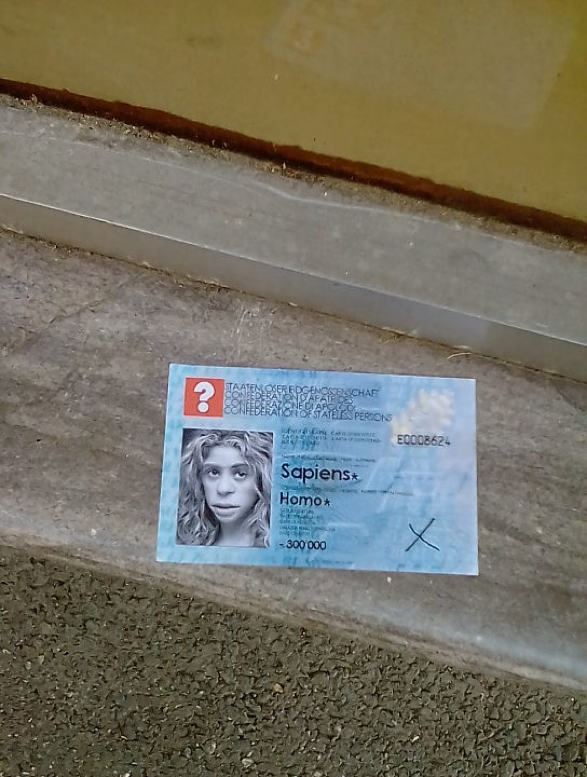 Cet enseignant et philosophe dans l’âme ne laisse rien au hasard. « Je remets en question la société en l’interrogeant sur son identité, voilà pourquoi j’ai détourné une centaine de cartes d’identité suisses que je laisse posées dans les rues, sur des bancs ou des murets, là où elles semblent avoir été oubliées, avec pour prénom Homo et nom Sapiens. Une manière de nous interroger sur qui nous sommes, au-delà de la nationalité. » Bizarre qu’une convention sociale définisse l’individu par le biais d’une carte « qui contient des données administratives sans répondre à la question de l’identité personnelle et de sa représentation envers autrui ». Sapiens abat les catégories pour ramener à l’humain, ce genre auquel nous appartenons tous et qu’il cherche à interpeler. Pour dire, en lieu et place de la croix blanche sur ses cartes détournées figure un point d’interrogation…