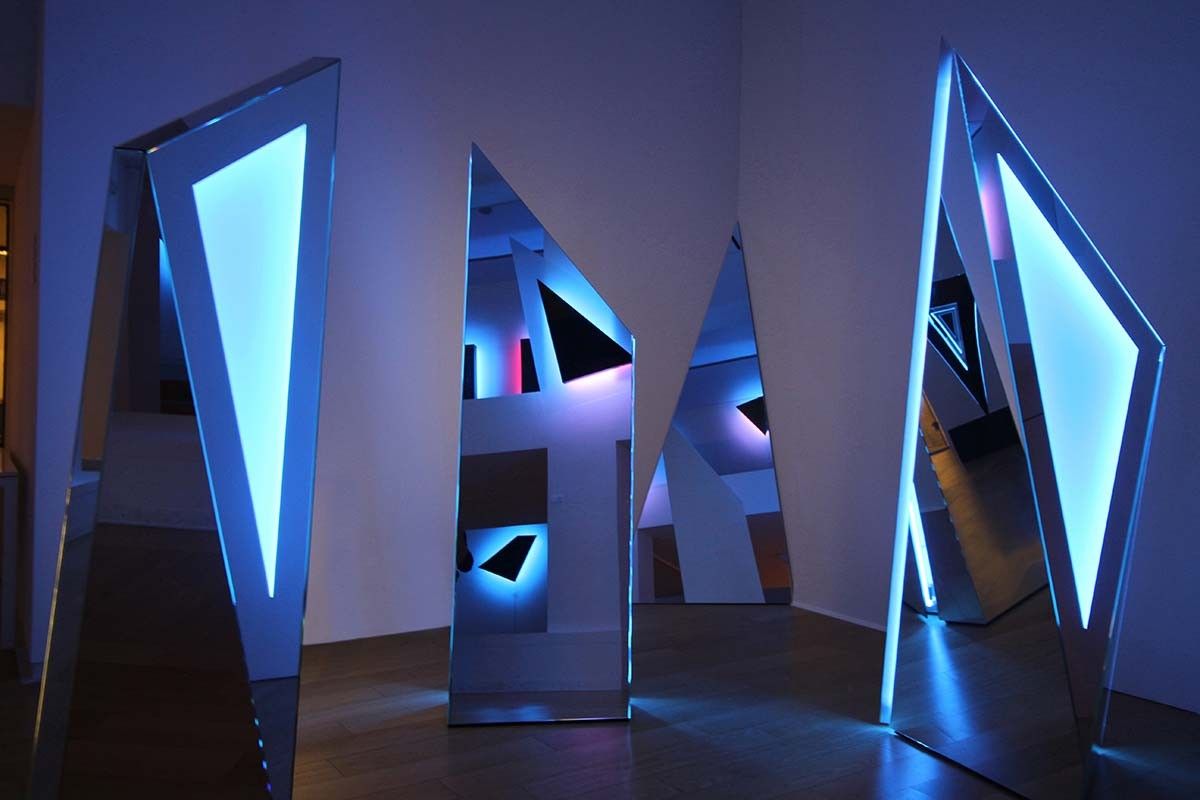 Fernanda Vigo apprend l’architecture à Lausanne, file ensuite aux États-Unis étudier les villas de Frank Lloyd Wright avant de rentrer dans sa Milan natale où elle ouvre son agence en 1959. La même année, elle entend parler d’un peintre qui cherche l’espace caché derrière le tableau en balafrant ses toiles à coups de couteau. Vigo s’invite dans l’atelier de ce dernier, Lucio Fontana, avec qui elle scelle une longue amitié. Il lui présente Piero Manzoni, l’artiste de la merde en conserve vendue à prix d’or et des achromes, ces tableaux plus blancs que les blancs de Malevitch. Les deux partagent une même vision artistique d’avant-garde. Il interroge le statut conceptuel de l’œuvre tandis qu’elle développe des environnements d’art total fait de lumière, d’ésotérisme géométrique et de surfaces réfléchissantes.
