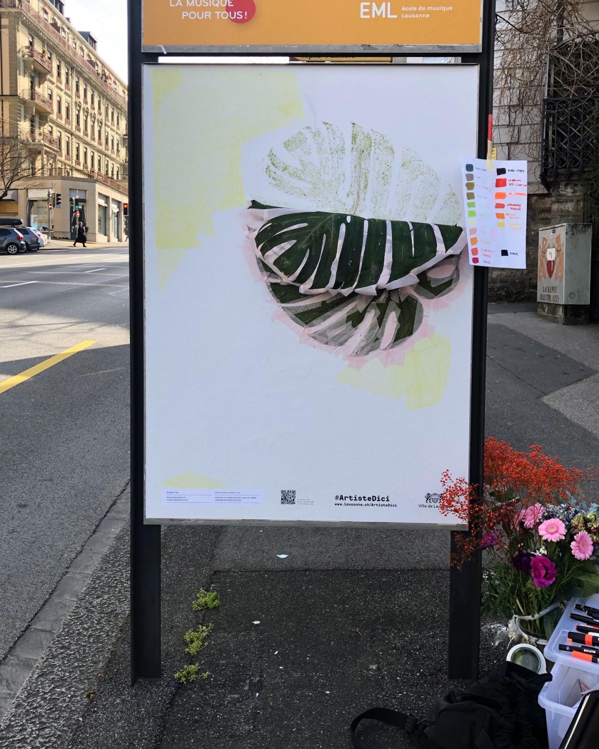 «Ma pratique s’intéresse à notre mode de vie actuel : la manière dont nous consommons et vivons, les nouvelles technologies qui s’offrent à nous et plus spécifiquement notre impact, en tant qu’humain, sur ce qui nous entoure. En ce qui concerne le projet « ArtisteDici », et puisqu’il est intéressant de développer une création directement sur place, j’ai eu l'envie de travailler l’empreinte des végétaux à travers la technique dite du marteau. Le projet consiste en une récolte de plantes, que j'ai travaillée à même l’affiche en les tapotant afin d’en extraire leurs pigments naturels et d’y apposer leurs marques. Ces mêmes pigments évoluent au fil du temps et laisseront une trace en mouvement.»