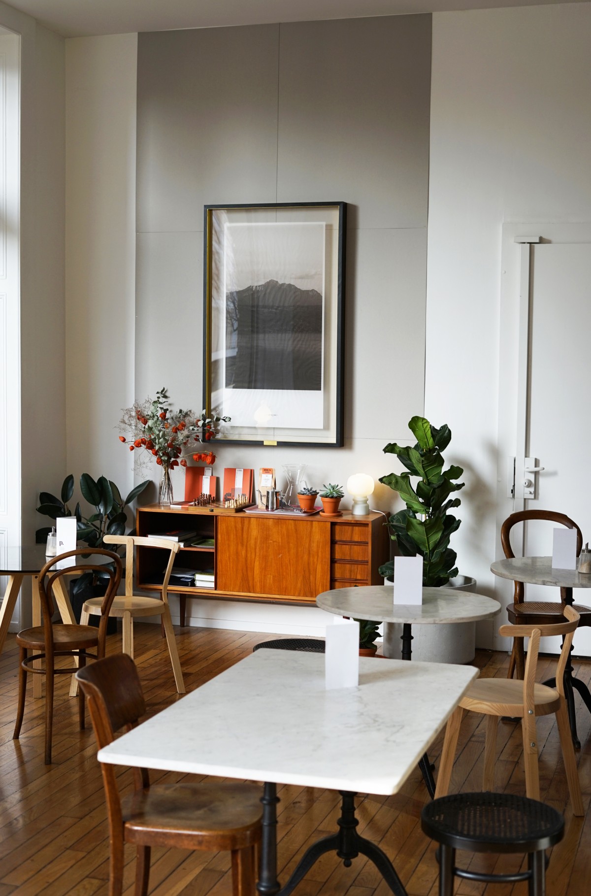 Un p pointé, une police de caractère que Jean Kehlhofer a dessinée pour le café qu’il avait déjà entièrement projeté dans sa tête. La réalité est non seulement à la hauteur de ses attentes, mais de celles des clients et des passants qui se retrouvent catapultés dans un univers sensible et chic. Pour chaque livre acheté, un bon pour un café est offert: «Je les ai sélectionnés en fonction des livres qui m’intéressent avec comme point commun tout ce qui est lié à l’image afin que les gens puissent s’asseoir pour s’évader et ne pas rester figés sur leur téléphone.»